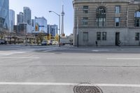 A view of a modern office building in downtown Toronto, Canada. The building stands tall against a clear sky, surrounded by the bustling city life. Urban design and architecture blend seamlessly in this metropolitan area.