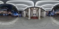 A fisheye mirror captures the grand entrance of an office building in downtown Los Angeles. The classic architecture stands tall against the cityscape at night, illuminated by street lights. A glimpse into urban design and city life in California's metropolitan area.