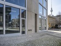 Modern office building in the heart of Berlin's business district. Clear skies reveal a sleek facade and urban design. Cobblestone road, bustling with city life, contrasts with the two men carrying umbrellas. Typical European urban architecture.