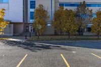 A bustling business district in Ottawa, Canada. Tall office buildings line the streets, while vibrant yellow trees add a touch of color. Cars fill the parking lot, as people go about their city life.