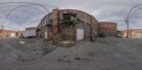 A fish-eye view captures the charm of an old urban neighborhood, with circular buildings and a prominent red brick structure. The tree-lined road and sunny skies add to the vibrant atmosphere.