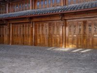 This stock photo showcases the charm of an old village in Lijiang, Yunnan, China. With its historic architecture, cobblestone streets, and traditional wooden buildings, this charming village takes you back in time. The image features a residential house with a wood-stained facade and a lovely courtyard. The windows, doors, and gate add to the picturesque scene. It's a beautiful example of classic architecture and urban design in China's old town, offering a glimpse into the city life of this vibrant Asian destination.