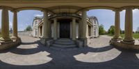 A sunny day in Ontario reveals a classic architectural entrance with columns and arches. The panorama captures the beauty of the historic architecture against a clear sky backdrop.