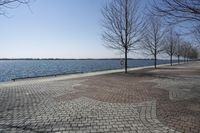 A serene coastal landscape in Ontario, Canada. Clear sky and calm water create a peaceful ambience. The road surface leads to a pier, with trees lining the shore. A perfect winter vacation spot in Toronto.