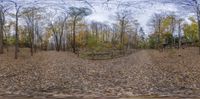 A serene landscape in Ontario, Canada. A small circular panorama on the ground near trees creates a fisheye lens effect. Clear sky and sunlight illuminate the deciduous forest, with a split-rail fence adding a rustic touch.
