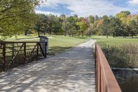 a wooden bridge over a paved path in the autumntime with fall foliage and a path winding through it