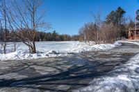 a walkway is blocked by snow and ice with bare branches on both ends of it