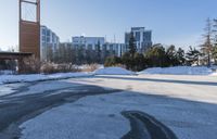 A cityscape in Ontario showcasing urban architecture and residential neighborhoods. Winter shadows cast hard contrasts on concrete streets and parking lots. Clear skies highlight the structural elements of hotels and residential buildings.
