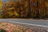 This image showcases a road in Ontario, Canada with a forest of trees on either side. The clear sky overhead compliments the vibrant colors of the surrounding foliage, including leaves on the ground. The road, lined with yellow and brown leaves, gives a sense of the autumn season. This photo captures a typical day in the serene and scenic landscape of Ontario, Canada.
