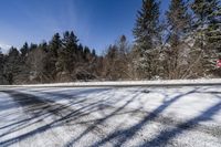 A winter landscape in Ontario, Canada. Snow-covered trees and branches create a picturesque scene. The clear blue sky contrasts with the white snow. The road cuts through the forest, adding to the scenic beauty of the area.