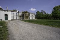 A classic architecture building with a lush green lawn in Ontario, Canada. Clear sky contrasts with the historic facade. The road surface leads to the tourist attraction, a museum in Toronto and Hamilton.