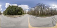 multiple angle photos of trees in the background from a panoramic view of an empty road