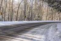 This is an image of a gloomy winter landscape in Ontario, Canada. The grey sky hangs over a snow-covered forest, with a road cutting through the scene. The road surface is covered with snow and the trees are bare and covered in frost. The vegetation along the road includes branches and twigs from woody plants. The overall atmosphere is bleak and freezing, with nature taking on a dormant state during the winter season. This photo captures the quiet and serene beauty of the Ontario countryside during a cold winter day.