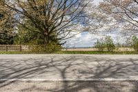 A rural road in Ontario, Canada, surrounded by lush greenery and trees. The road surface casts hard shadows, creating a picturesque landscape. Benches and dirt roads add to the charm of this peaceful path.