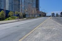 A wide empty road in Ontario, lined with modern architecture and skyscrapers. The clear day sky is reflected in the glass walls of the buildings. A typical scene of urban life in Toronto.