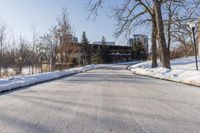 A straight view down a snow-covered road in a suburban neighborhood in Ontario. The clear winter sky contrasts with the freezing temperatures. Residential architecture lines the road, showcasing the infrastructure of the area.