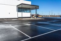 This image captures a sunny day in Toronto, Canada. The clear sky highlights the asphalt road and parking lot in front of a row of storefronts. The image depicts a typical scene in Ontario, with people going about their day, visiting shops and stores. The urban landscape and the busy road reflect the vibrant atmosphere of the city. It showcases the blend of commerce and everyday life in Toronto.