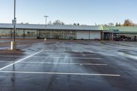This is a photo of an empty parking lot in Toronto, Canada. The clear sky above contrasts with the asphalt ground, showing that it is a sunny day. The photo represents a typical winter or spring day in Ontario. The storefronts of various shops are visible, indicating that it is a shopping area. Despite the absence of cars in the parking lot, some cars can be seen parked outside the lot. This image captures the calm and quiet atmosphere of a day in Toronto.