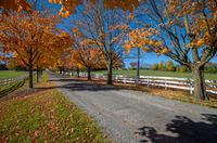 This image captures a rural road in Ontario, Canada. The asphalt path stretches through a field, surrounded by vibrant fall foliage from two trees. The leaves on the trees have turned shades of orange, yellow, red, and blue, creating a stunning display of color. The clear sky above casts a hard shadow on the road, adding depth to the scene. This photo represents a peaceful day in rural Ontario, with beautiful greenery and the changing colors of autumn.
