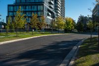 A modern city street in Toronto, Ontario. Tall buildings with sleek architecture line the road, casting hard shadows. The clear sky offers a perfect backdrop. A bustling urban scene with shops and storefronts, surrounded by green grass.