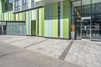 A modern architecture building in Toronto, Ontario. The glass walls provide a clear view of the vibrant city life. The green vegetation adds a touch of nature to the concrete surfaces. A perfect urban design for city living.