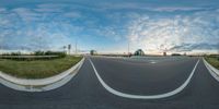 a view from a fish eye lens of a road and a building in the distance