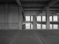 This black and white photo captures a modern architecture building in Berlin. The door is open, revealing an urban space. The concrete street leads straight down the road, creating an open space in the city. The cloudy day adds to the atmosphere of this European city. The parking deck or garage can be seen in the background, showcasing the urban design of the area.