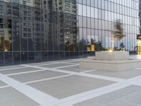This is an image of a white bench placed in an open space between two tall buildings in downtown Los Angeles, California. The modern architecture of the buildings features sleek facades with large windows and clean lines. The empty sidewalk reflects the early morning dawn in the business district. The urban design creates an inviting and spacious atmosphere, with the surface of the road devoid of any vehicles. This photo captures the essence of a calm and serene moment in the bustling city of Los Angeles.