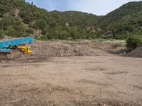 two yellow bulldozers work on sand and gravel in a mountain valley while another one looks at it