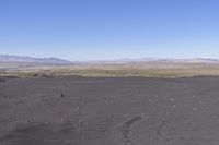 A rugged desert landscape in California, USA. The open space is dominated by mountains and plains, with scattered rocks and gravel. The clear sky enhances the beauty of this natural environment in Pisgah region.
