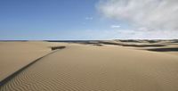 Vast desert landscape with rolling sand dunes. The open space stretches to the horizon, where blue skies meet distant water. Clouds add depth to the natural environment. An awe-inspiring day in the desert.