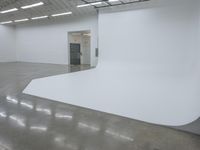 An open space interior in Los Angeles, California. The modern architecture features white cement floors and a high ceiling. The design of the room is minimalistic, with clean lines and a warehouse-like feel. Perfect for a photo studio or creative studio space.
