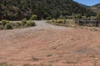 This is an image of a road surrounded by red rocks and grass in the wild and rugged landscape of Utah. The open space showcases the unique vegetation and natural environment of the area. The path leads through the canyonlands and mountains, giving a sense of adventure and exploration. The dirt road and corral hint at the agricultural and ranching infrastructure that exists in this wilderness. This photo captures the beauty of Utah's land lot and biome, showcasing the diverse and striking scenery that can be found in this state.
