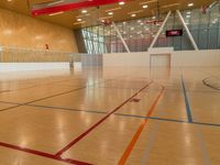 an indoor gym with wood floor and basketball court in background with windows and a television above
