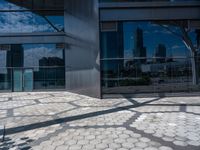 the outside of a building with a shadow of a tree on a pavement and there are skyscrapers in the distance