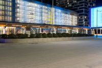 a large, modern building has many windows on each side of the building at night