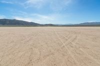 a sandy area with two mountains and sparse grass on the horizon in the distance is dirt that runs through the foreground