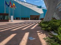 An open space in Zaragoza, Spain with modern architecture and cobblestone surfaces. Hard shadows create a dramatic effect under a clear sky. The hotel's unique design stands out in this urban landscape.