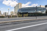 The modern glass-walled office building in Ottawa's business district stands tall against a clear sky. The futuristic architecture and urban design create a striking cityscape. The busy road with parked cars adds to the bustling city life.