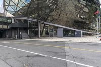 A modern architectural building in the business district of Ottawa, Canada. The glass facade reflects the clear sky and surrounding urban design. Trees and vegetation line the asphalt road, creating a vibrant public space.