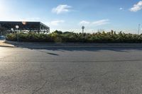 the skateboard is parked on the road at the side of the street with the trees in the background