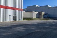 This is an image of an asphalt road in a residential area in Ottawa, Canada. The clear sky and hard shadows create a bold contrast against the buildings and composite materials used for the road surface. In the foreground, a gas fixture can be seen casting a shadow. The office buildings in the background suggest a bustling urban environment. This photo represents a typical day in Ottawa, showcasing the city's infrastructure and property landscape.