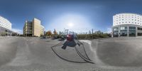 A panoramic view of Ottawa's cityscape, captured by a drone. The urban architecture is bathed in sunlight, casting long shadows on the asphalt roads and parking lots. The buildings stand tall against a clear blue sky.