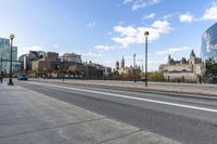 This is an image of a modern business district in Ottawa, Canada. The clear sky overhead highlights the futuristic architecture of the office buildings and residential areas. The cityscape is captured in this urban design, showcasing the street lights, roads, and curbs. The asphalt road surface leads the viewer into the urban city life. This photo represents a typical day in Ottawa, where modern architecture and urban design create a bustling business district.