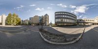 A spherical view of an empty road in Ottawa, Canada, surrounded by buildings. The urban landscape showcases a mix of residential areas, office buildings, and public spaces. The bright sunshine casts hard shadows on the pavement.