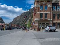 A view of a suburban road in Ouray, Colorado. The road leads to a charming village with quaint storefronts. Majestic mountains provide a scenic backdrop on a clear day.