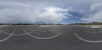 A spacious outdoor parking area with a smooth asphalt road surrounded by lush green grass and trees. The open space provides opportunities for various sporting events. The gloomy grey sky adds a touch of mystery to the scene.