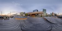 An oval-shaped wooden boardwalk at the waterfront of Wellington, New Zealand. Modern architecture of nearby buildings contrasts with the natural wood. The city's business district comes alive with the dawn light.