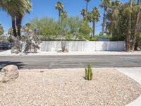 This stock photo features a stunning example of modern architecture in Palm Springs, California. The image showcases a beautiful residential home with a white brick wall, surrounded by lush greenery and palm trees. The clear sky overhead adds to the serene atmosphere of this suburban villa. The house is located in the Sonora Desert and its design incorporates mid-century elements, such as the unique brick and tile walls. The clean lines and profile of the building seamlessly blend with the surrounding natural landscape. It is a bright sunny day, making this an ideal image to represent the modern residential architecture of Palm Springs.