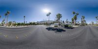 a street with cars and palm trees on both sides in the desert with a sun and sky in the background